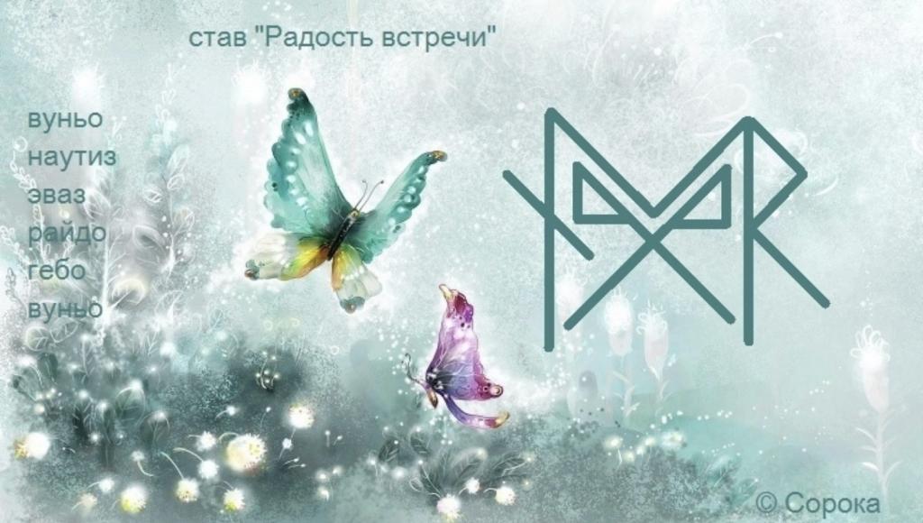 Руны в ставе: ВУНЬО, НАУТИЗ, ЭВАЗ, РАЙДО, ГЕБО, ВУНЬО