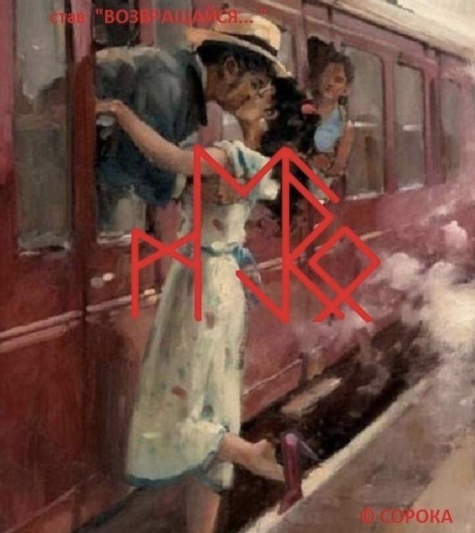 Изобразите став на дорожной сумке где- нибудь в укромном месте, активируйте своим дыханием. Срок оговорите до возвращения мужчины домой. Когда приедет, смойте став с благодарностью к рунам.