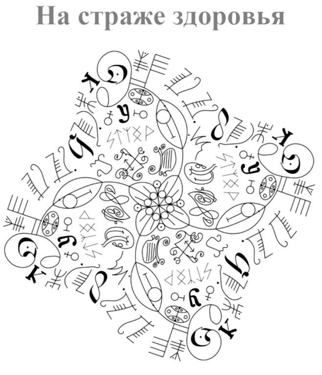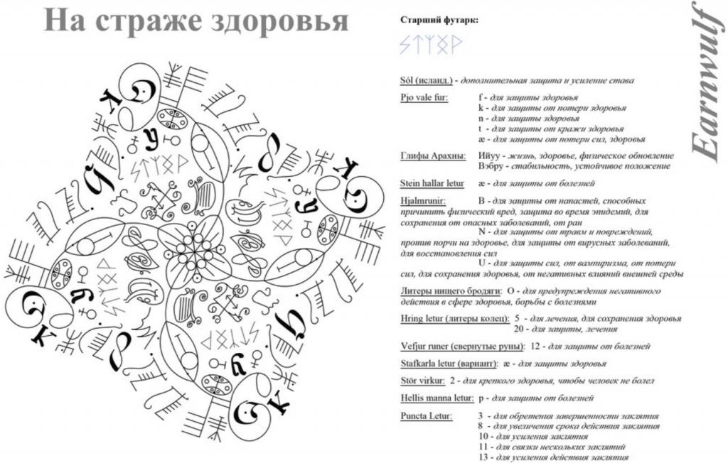 Основу составляет Pjo vale fur, вокруг нее расположены остальные знаки. На наружном контуре - более жесткие руны и литеры защиты.