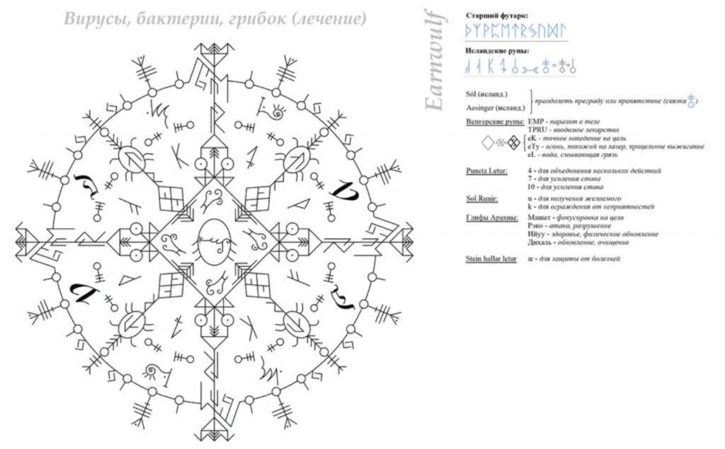 Альгиз - защита места введения; связка Sól и Aesinger (исл.) - преодоление преграды, собственно введение лекарства; Тейваз (3 шт.) и Райдо - лекарство направляется в нужное русло (ищет и находит чужеродный объект);