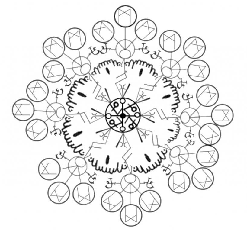 - литеры алфавита Аарона «Оповестить», с вписанными в них турецкими рунами , предназначенными для собирания разрозненных потоков энергии и объединения их в единый поток. И вписанными над ними (над литерами алфавита Аарона «Оповестить») литерами алфавита Аарона «Найти и доставить».