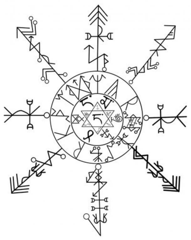 вне звезды находится .1-Тибетский знакNga-для экзорцизма и разрушение вредоностных чар,2-Тибетский знак-ma-помогает избавиться от некропривязок и распугать умертвий.3-глиф-Дихаль чистка,обновление.,потом вязка рун из тейваз,совелу,tví-örvaðr bogi.