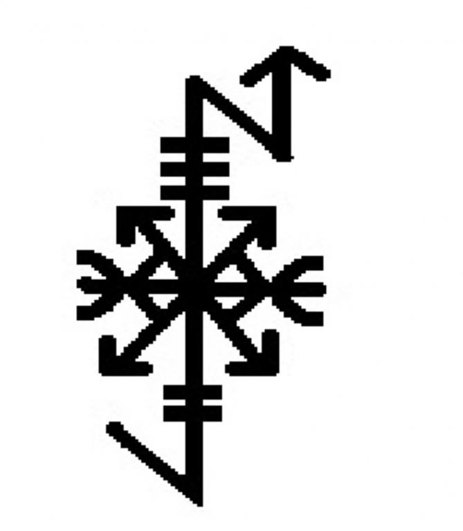 руна Зиу(тут она зеркально отображена) - руной силы, сосредоточения энергии, справедливости и воздаяния по заслугам.