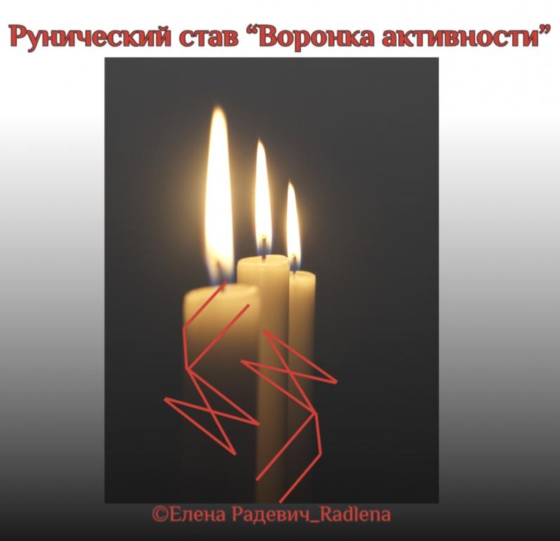 По составу рун все просто: Уруз, Дагаз и Йера. Начертите воронку на свече. Свечу поставить на фото. Проговорите своё намерение. Можно активировать и дыханием, и провести над пламенем свечи, но потом свечку на фото и пусть горит.