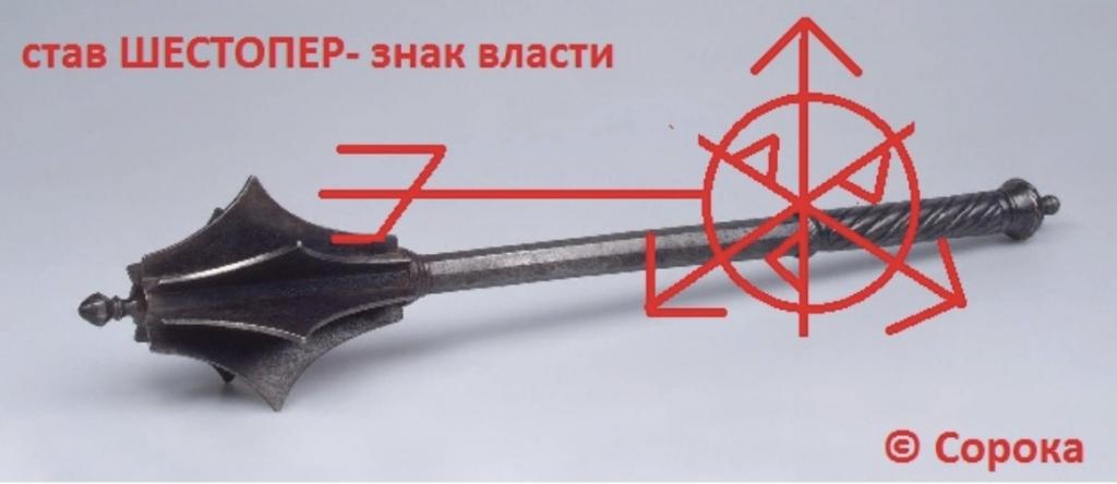 = Шестопёр. Головка шестопера состояла из металлических пластин — «перьев» (отсюда и его название). Шестопер, распространенный главным образом в XV—XVII веках, мог служить знаком власти военачальников, оставаясь в то же время серьезным оружием
