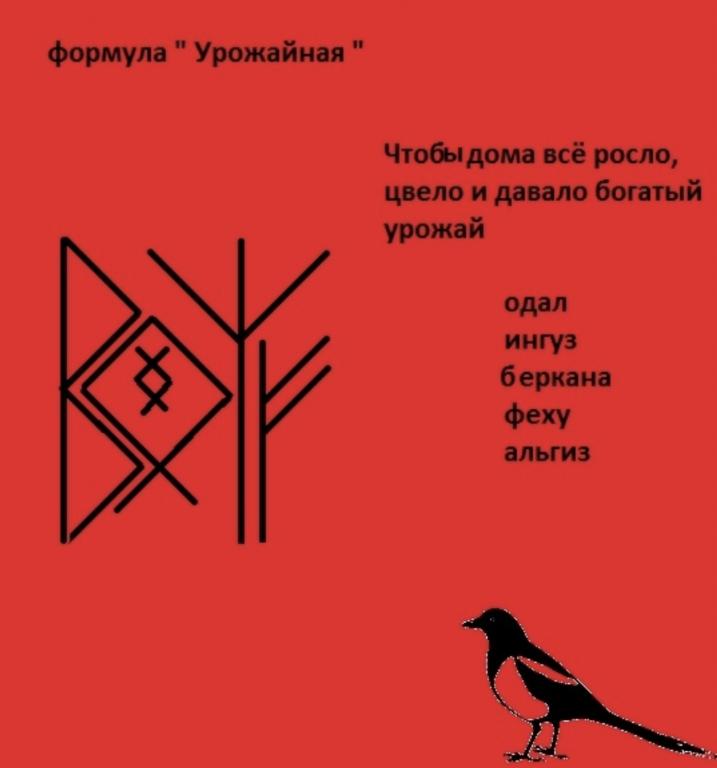 Порунно расписывать не буду, и так всё видно. Сделать амулетом с обращением к четырём стихиям, кто не умеет, изобразите руны на фотографии участка, активируйте своим дыханием. До осени уберите амулет в укромное место. Как уберёте урожай с участка, сожгите формулу с благодарностью.