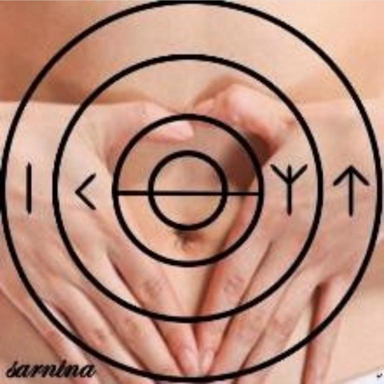 Чертим с правого угла, соединяя попарно руны: Альгиз и Тейваз - оградиться поддержкой высших сил; Кано и Иса - лечение органов пищеварения.