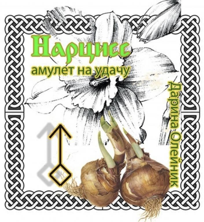Рунический амулет на удачу и исполнение желания. Делается в период (с 20 по 23 марта) весенннего равноденствия. Для его изготовления вам потребуется луковица нарцисса. При ее отсутствии можно рисовать на бумаге, но активировать смесью биоматериала и сока нарцисса (выжать из стебля приобретенного цветка несколько капель, смешать с капелькой вашей слюны или крови и пройтись по контуру.