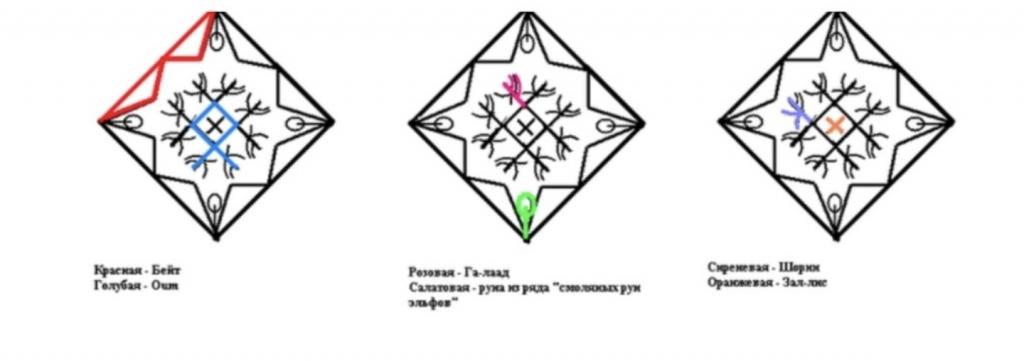 №1 - середина из 4 рун Oum, в центре - Zallis, на Oum крепятся Шорин и Га-лаад, внешний квадрат состоит из 4 рун Бейт, по углам - руны О из "смоляных рун эльфов" (для наведения чар на голос).