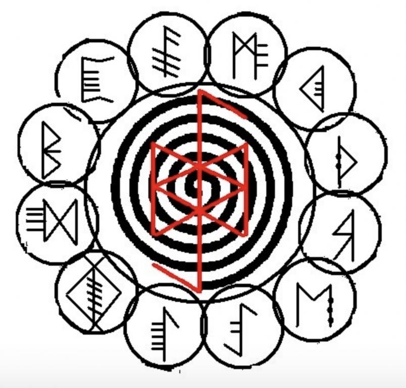 Состоит из 12 маленьких кругов с вписанными рунами и огамами, объединенных одним большим, в центре которого вязь из задействованных рун, а также вписан глиф "расширение" (расширение возможностей и увеличение силы) - для усиления эффекта.