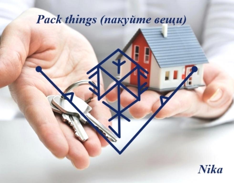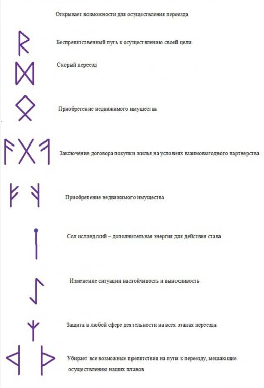 Данный рунический став (ДРС) открывает и притягивает к (имя или семье) возможности для переезда в комфортные для оператора сроки на постоянное место жительства, разрушает и убирает все препятствия на пути к переезду, мешающие всему переезду, привлекает в необходимом количестве денежные средства на приобретение недвижимого имущества из законных источников, кроме кредитных средств и получения наследства, а также став направляет правильно оформить сделку купли-продажи на выгодных условиях, с соблюдением всех норм действующего законодательства, а также став защищает (имя) на всех этапах переезда и осуществления сделок.