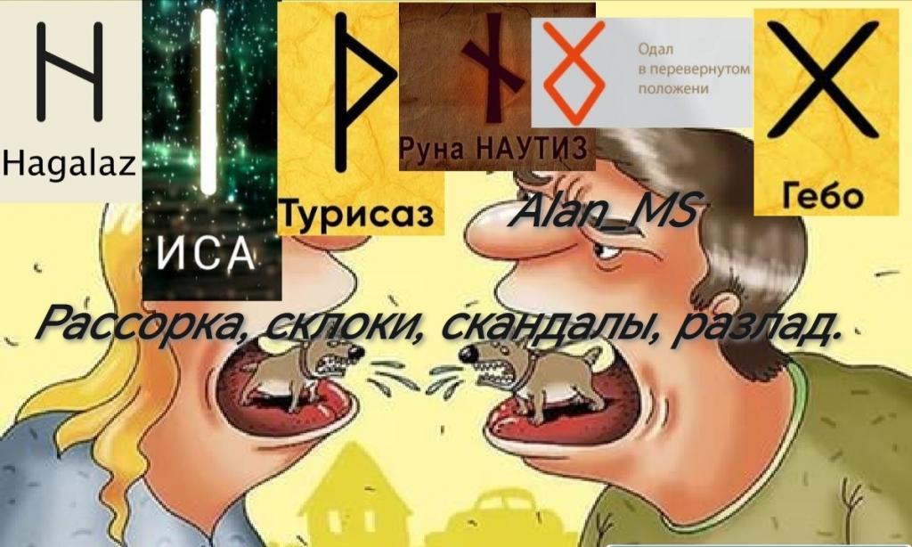В рунической магии для обозначения негативных воздействий, таких как рассорка, обычно используются руны, символизирующие разрушение, конфликты, препятствия или холод: