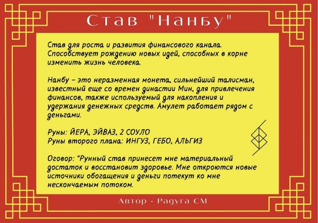 Рунический став Нанбу поможет Вам в достижение желаемого благополучия.
