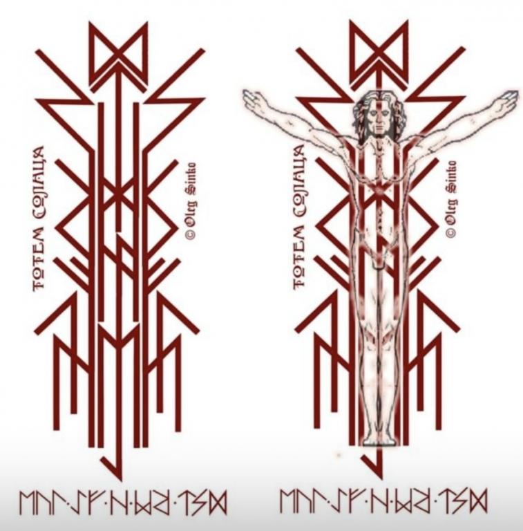 Совело – выходит от груди в плечи и как крылья над руками. Тейваз через голову в 7 чакру и в ней же – Дагаз.
