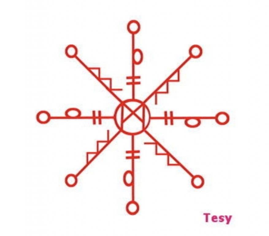 Манназ - человек, заключен в Соль, здесь защита. От этого всего расходятся 8 лучей - сторон света, на концах каждого луча, так же Соль, для "подсветки", что бы человеку легко было двигаться и ориентироваться. На диагоналях - Вуньо и Райдо ( и то и то по 4) - движение легко и непринужденно)) На основных осях, глиф "Ein-hvefingar hægri" -происходит от слова "палец"(fingur),предназначались для обозначения правой и левой рук, сторон света (юг и север),тьму и свет. Таким образом у нас получается Навигатор