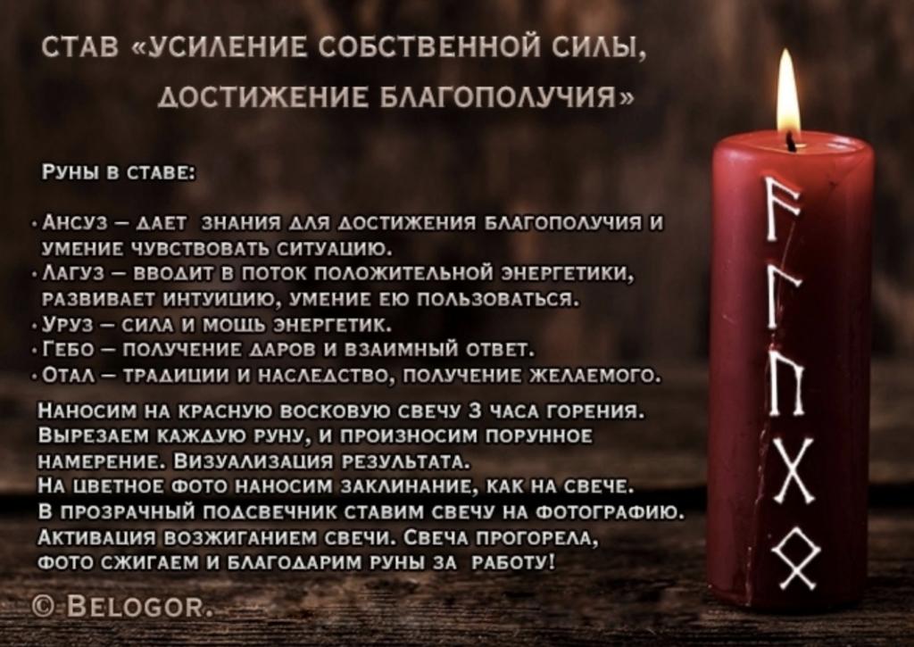 Наносим на красную восковую свечу 3 часа горения. Вырезаем каждую Руну, и произносим по рунное намерение. Визуализация результата. На цветное фото наносим заклинание, как на свече. В прозрачный подсвечник ставим свечу на фотографию, Активация возжеганием свечи. Свеча прогорела, фото сжигаем и Благодарим Руны за � работу!
