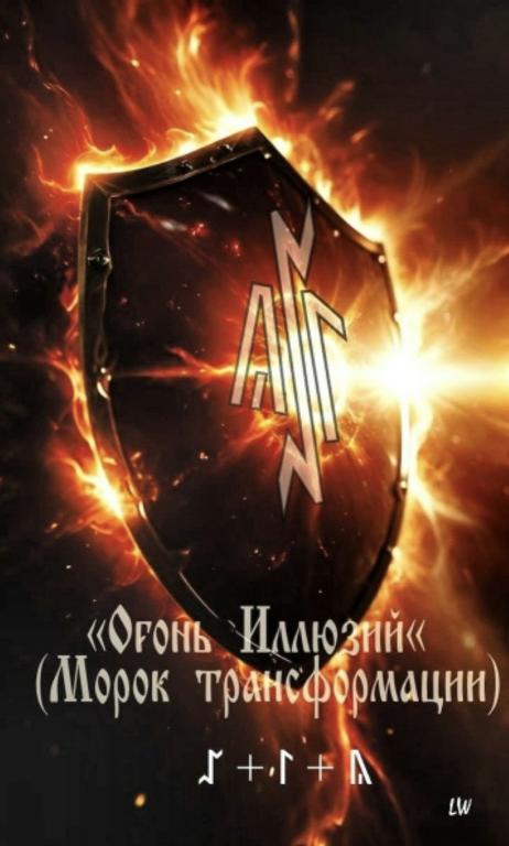 - Принцип действия: Став активирует "огненный морок", где Cweorth (центр) сжигает "старое" (реальность, воспоминания, энергии), Laguz (вокруг) добавляет поток лжи (как вода, испаряющаяся в пар), Yr (стрелы) направляет иллюзию точно в цель (как эльфийский выстрел — незаметно и метко). В пламенной форме став выглядит как огонь: Cweorth — пламя, Laguz — волны пара, Yr — летящие искры. Энергия "испаряется" в туман: чужой взгляд/диагностика видит "огонь" (опасность, перемены), но на деле это обман — реальность скрыта, а цель "сгорает" в иллюзии. Став пассивно-активный: пассивно маскирует, активно трансформирует (например, враг видит "победу", но теряет). Срок: 7–40 дней (как огонь — разгорается, угасает), с обновлением — до 3 месяцев.