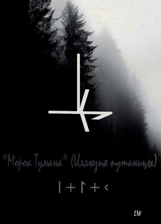 — это руническая формула, предназначенная для создания энергетического "тумана" или морока, который искажает восприятие реальности, вводит в заблуждение врагов или нежелательных лиц, и защищает оператора через обман. Это не агрессивный став, а скорее оборонительный, работающий на уровне иллюзий: он "замораживает" правду, "размывает" видение и "освещает" ложным светом. В скандинавской традиции такие формулы связаны с магией "seiðr" (колдовство иллюзий), где руны используются для манипуляции восприятием, как у Локи или Одина в "Hávamál" (Старшая Эдда), где Один упоминает руны для обмана и фиксации лжи.