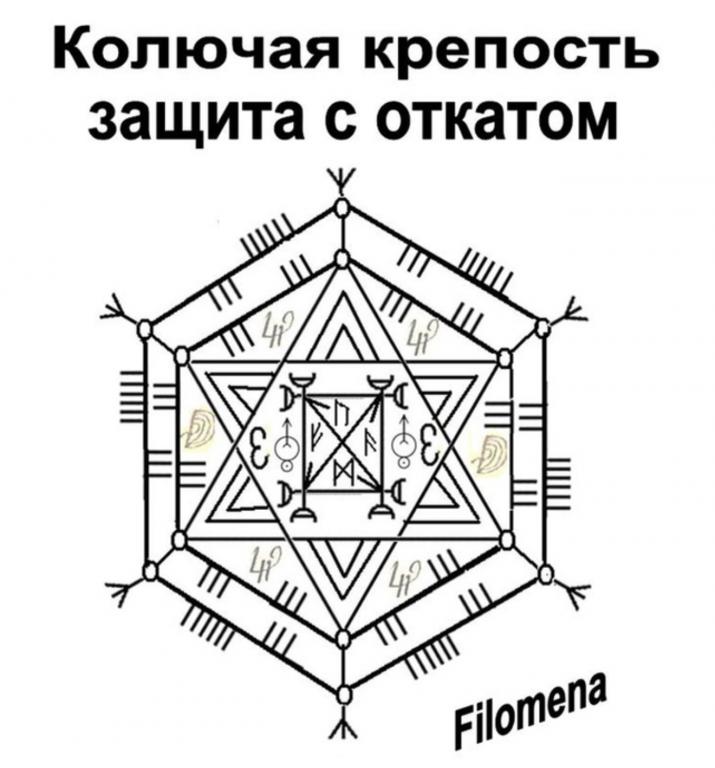 Защита с откатом - отличная защита получилась , все правильно составлено, руны правильно выбраны и вписаны, литеры прекрасно размещены в ставе, структура у става замечательная, описание верное и очень хорошо, все сделано великолепно .Можно использовать для защиты, для создания отката, работа вполне выдержит достаточно сильное, мощное магическое нападение, за счет как раз центральной формы, которая образует гексаграмму.