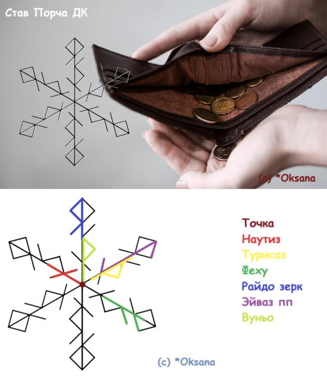 Силой данных рун, в самом скором времени у объекта (имя) принудительно отсекаются возможности в получении материальных ценностей из возможных источников, что приводит к откату в изначальную позицию, где его доход был ниже, достаток переходит на более низкий уровень, чего объект не замечает и в целом доволен ситуацией.