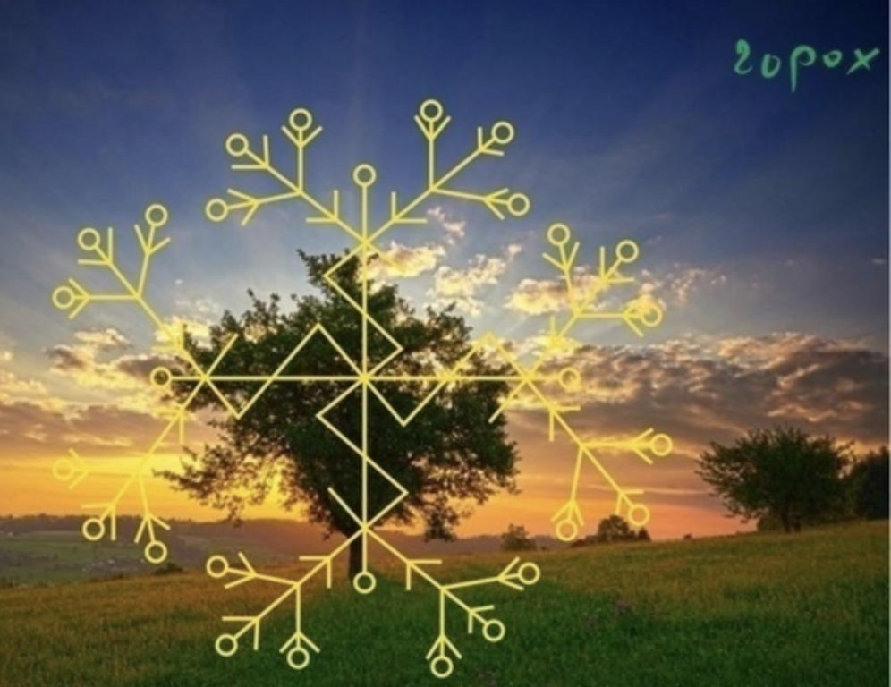 Основу составляет Солнечный Щит - Эйваз+Соуло ... также присутствует Тейваз, Свастика, Альгиз, Сол и Хагал, а также судя по всему Турисаз скрытый ...