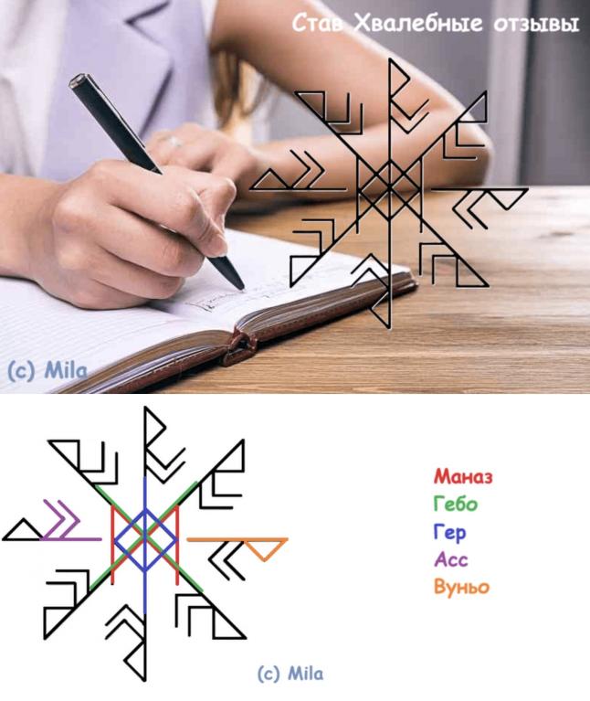 Реклама двигатель торговли — это всем известный факт. И хвалебные отзывы была и есть самая дешевая и сама действенная реклама, а значит для нашего материального процветания очень важно, чтобы хвалебных отзывов было чем больше, тем лучше. Для того чтобы получать свои заслуженные хвалебные отзывы можно воспользоваться помощью рун, в виде данного рунного става.