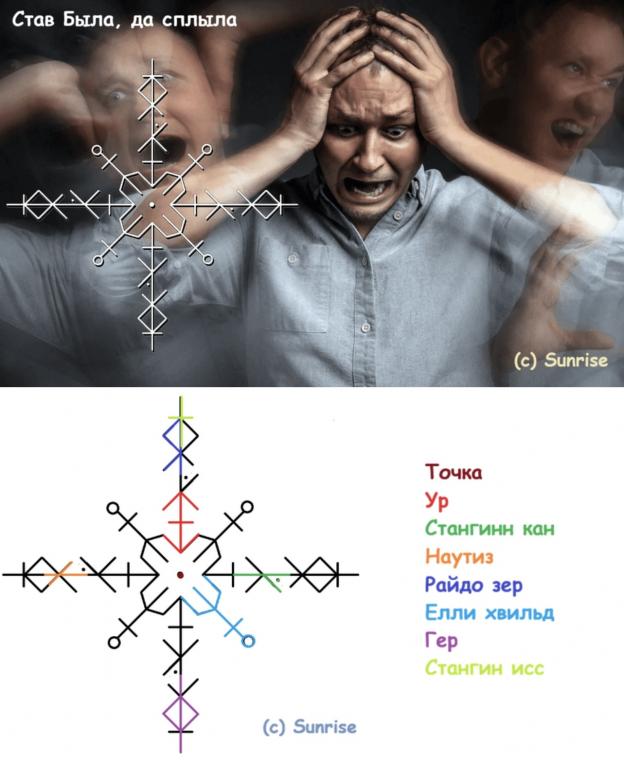 Сила данных рунных знаков вызывает хаотичное обрушение ударов на объект со всех сторон, дезориентируя его и затрагивая самые болезненные и уязвимые места, принудительно удерживая объект в замкнутом круге повторяющихся ситуаций, лишая его сил и ресурсов, ослабляя способность сопротивляться, при этом работа става действует постоянно и непрерывно, оставаясь скрытой от любого просмотра и диагностики.