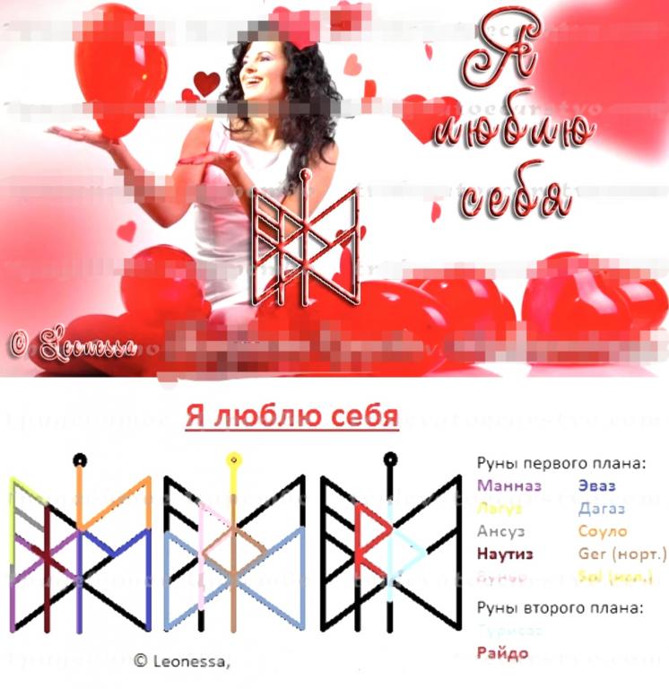 Под воздействием данных рун, в самое ближайшее время, я начинаю мыслить и действовать с любовью и уважением к себе. Я осознаю и понимаю, что я самая (перечислить то-что надо внушить), например: привлекательная, умная, стройная, сексуальная, уверенная в себе и т.д) Я с любовью принимаю себя и свои поступки. Я люблю себя и это приносит мне радость и удовлетворение. Силой рун и волей моей — да будет так!