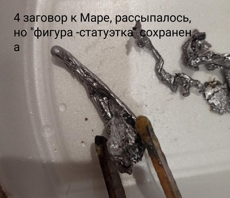 у вас такие простыни из фото ужас, зачем ненужные фото выкладывать? Читать и сложно и неохото. Описываю крайнее фото, на вас 2 покойника, один родовой, другой к вам приставленный с погостным заделом, вышла сущака жирная ещё,+ проклятие на охране сущь, крадник тоже под замком, и то что не переплавилось так оно на вас еще неизвестно что. Имхо если вы поканяетесь Маре то и перекладом убирайте, зачем отливать? Метод вообще не правильно выбран. На истину не претендую... Но мара Владычица тьмы, так вы поймите вы её помощников гоняете...что само по себе абсурдно, если оно вам не надо так и перекладом уберите, это проще.