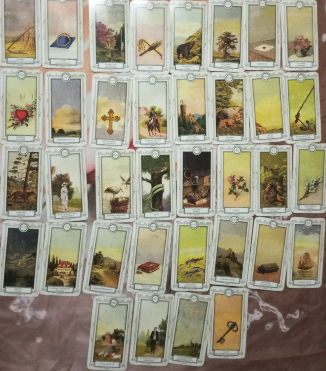 Чувства: в доме сердца-аисты,само сердце в горе,аисты идут на крысы, башню и горы-препятстьвия какие-то, цепочка: сердце-аисты, аисты-сад;сад-совы;совы-солнце;солнце-якорь;якорь-кольцо; кольцо-дама; дама-всадник, всадник-дом, дом-ребенок; ребенок-луна,луна-собака; собака-гроб;гроб-тучи,тучи-звезды; звезды-развилка; развилка-рыбы; рыбы-лиса; лиса-башня-башня-клевер; клевер-букет; букет-ключ; ключ-книга;книга-крест; крест-дерево,дерево-мужчина...мужчина-метла, метла-корабль, корабль-письмо; письмо-лилии, лилии -гора, гора-сердце.Очень длинная цепочка выходит. :-\ Что может значить? По цепочке мужчина будет далеко, будет слать письма любовные,секса не будет, любовник далеко будет.Карта сердце идет конем на звезды в тучах, на змею в медведе, и на якорь в солнце-будут не ясные перспективы, его бывшая будет вмешиватся, как раз недалеко от него находится. Между им и ней (змеей)звезды и башня-расстояние и общение по алиентам только, в мыслях у нее звезды+крысы+тучи=хочет нарушить планы, неприятности провернуть.Она находится в доме медведя и стоит на медведи-влиятельная женщина...