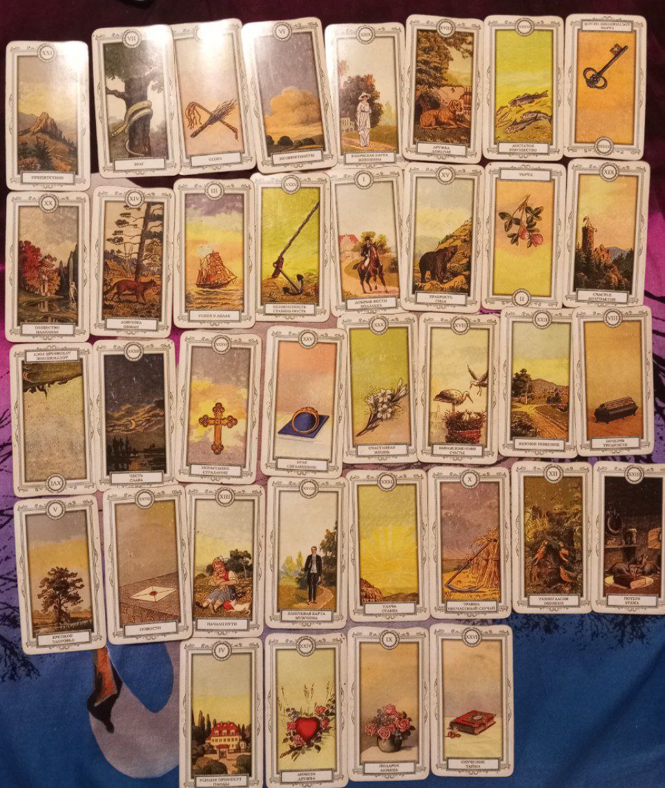 Первые четыре карты гора, рыбы, коса и лилии, указывают на финансовые сложности. Коса и лилии дают плохое сочетание, но не могу понять о чем оно говорит в контексте финансов. Еще коса зер. букет и луна, кк - тучи. Не могу связать с событиями пока, сочетание очень не нравиться.